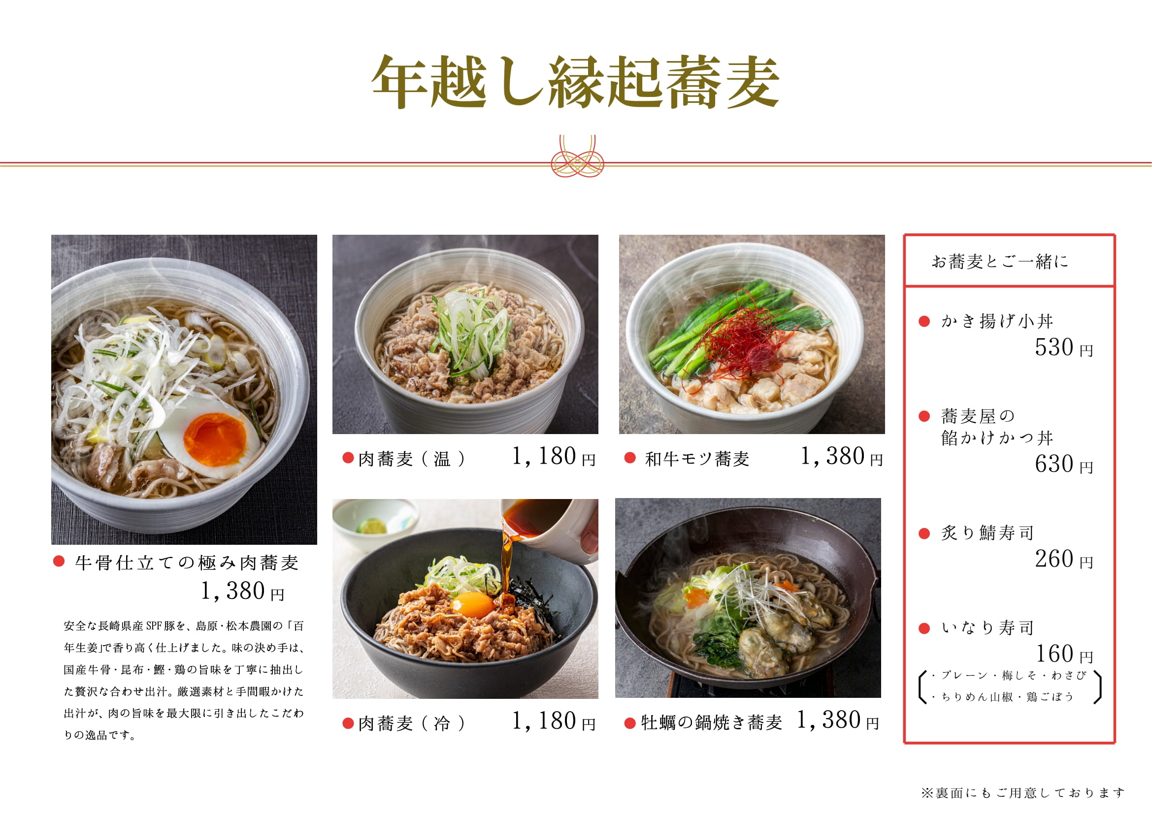 12月28日より、一年の厄を払い、長寿を願う「縁起蕎麦」をご用意しております。
